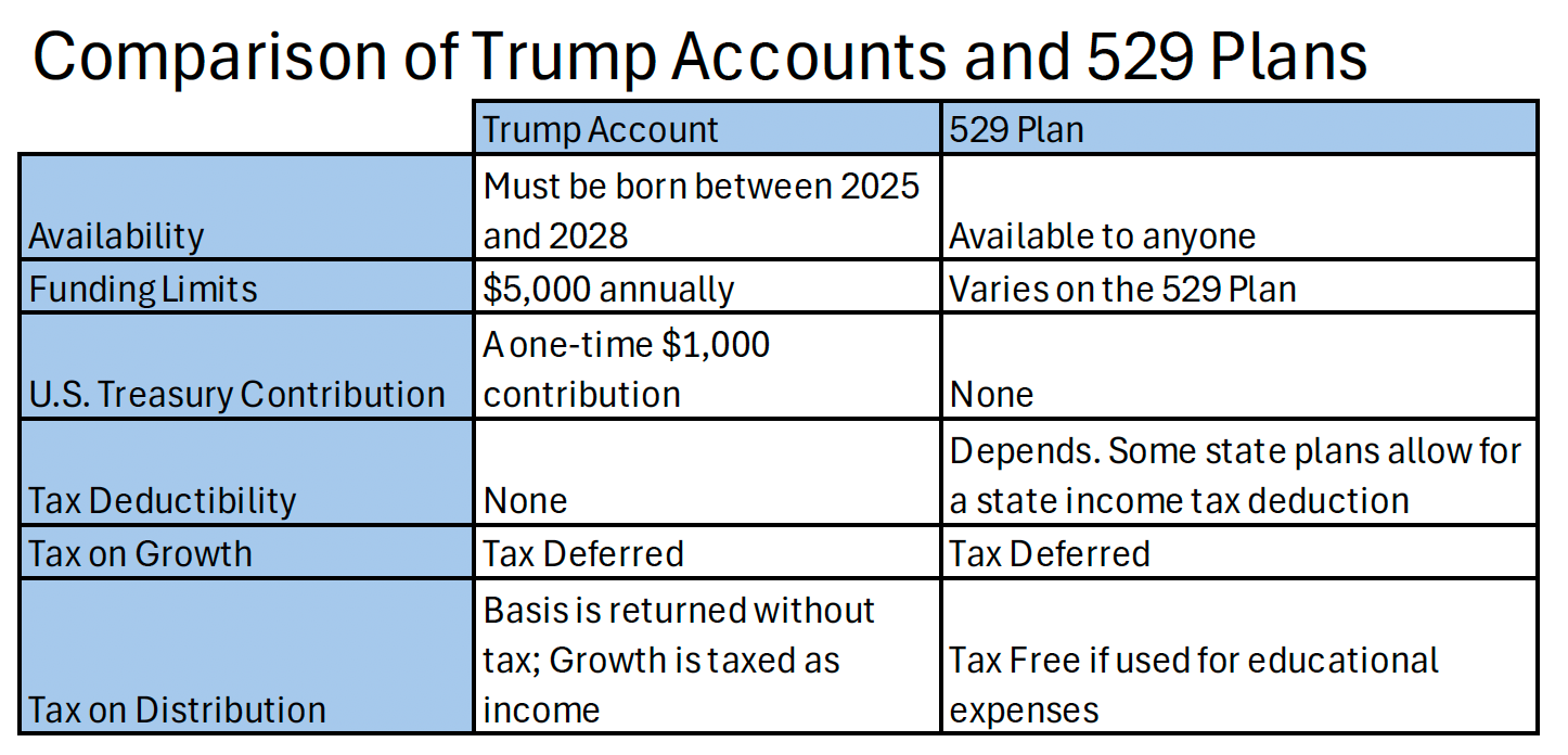 The distributions for Trump Accounts are a bit more complicated and less advantageous than 529 Plans; however, Trump Accounts can be used for essentially anything, where a 529 Plan is limited to educational expenses.